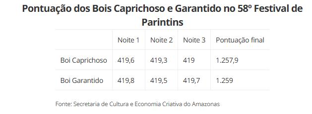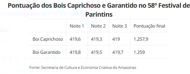 Na contagem final das notas, o Garantido somou 1.259 pontos, enquanto o Caprichoso ficou com 1.257,9. Ao analisar o desempenho por noite, o “Boi da Baixa”, como é carinhosamente conhecido pelos torcedores, levou a melhor em todas as três noites de apresentação. Veja as parciais abaixo: